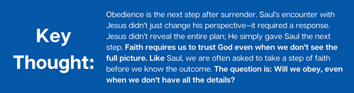 Obedience often comes with uncertainty, but it also comes with purpose. Saul’s obedience led to his calling. What could your next step of obedience be leading you toward?